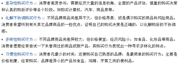 从上面可以见到,我们根据购买者的参与程度和产品品牌差异程度可以区分出四种购买类型:
